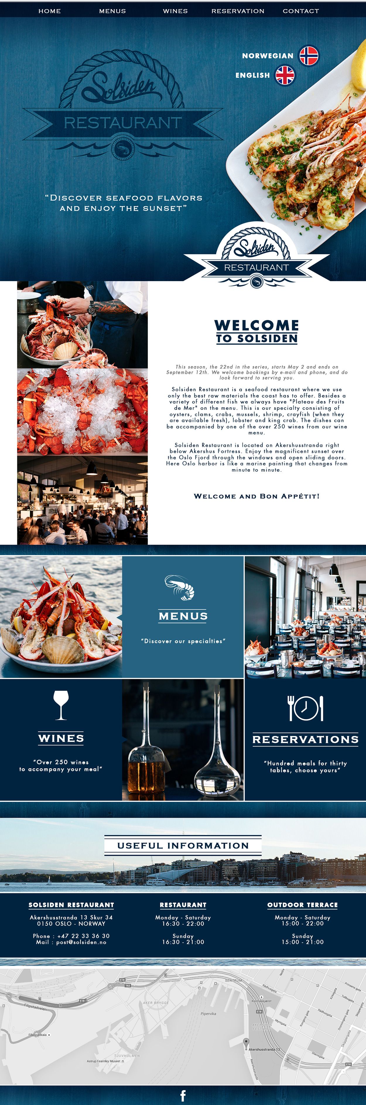 Realization of a logo and webdesign for the restaurant Solsiden. Solsiden is a seafood restaurant situated on the Port of Oslo. After have seen their website, I decided to create my own version, by choosing to emphasize on the food and the “fishing” side.